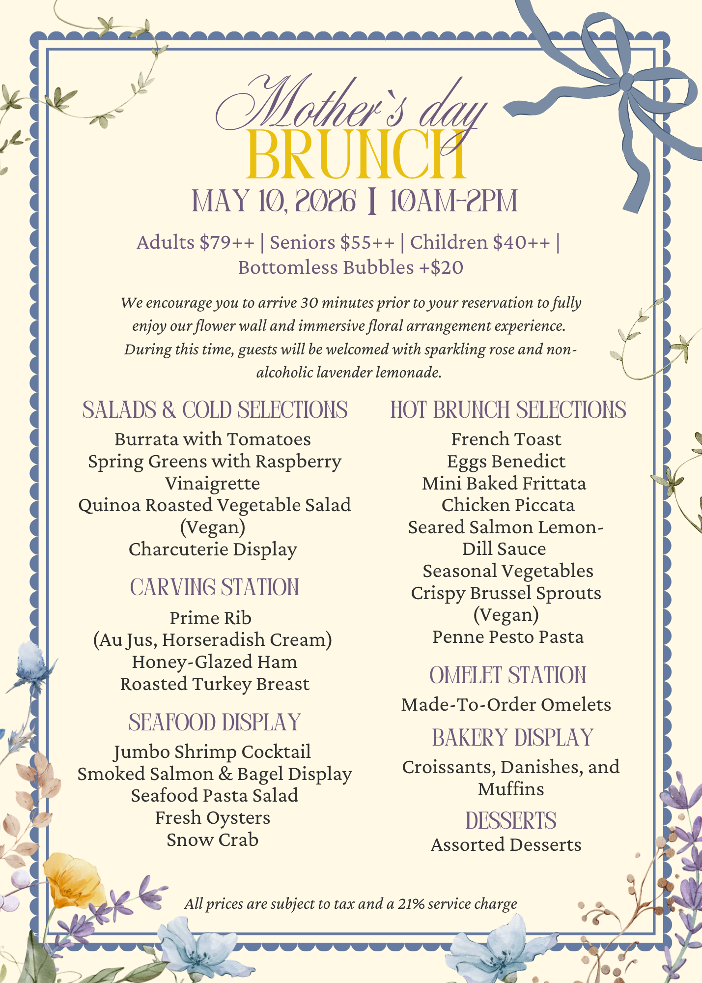 A thoughtfully curated brunch awaits. From fresh, seasonal salads and elegant seafood displays to made-to-order omelets and classic brunch favorites, each offering is crafted to bring people together. Indulge in carving stations, warm selections like eggs benedict and french toast, and a dessert display that invites a sweet finish to your time together, creating an experience that feels both timeless and joyfully shared.